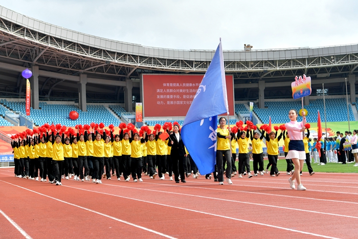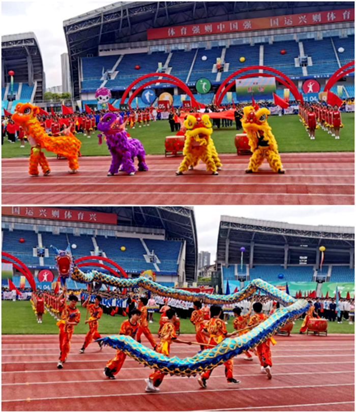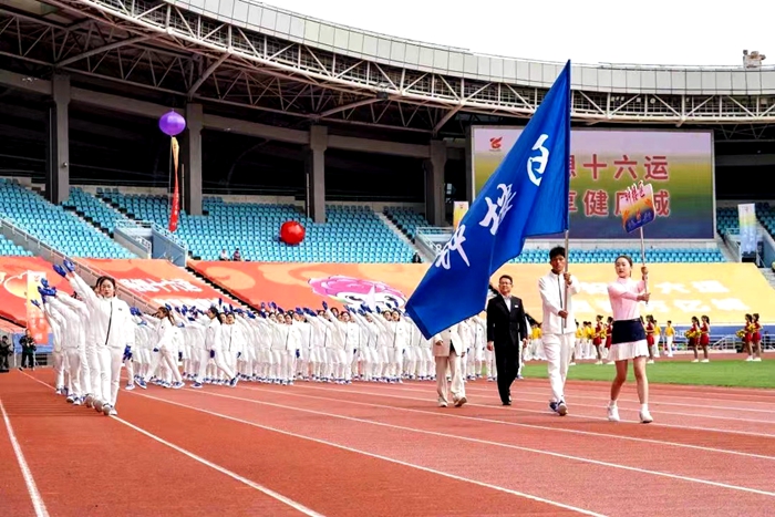 5月7日上午,常州市第十六届运动会在常州奥体中心体育场开幕。上午9时,伴随着雄壮激昂的入场进行曲,国旗、市运会会旗、红旗、彩球方阵,以及来自溧阳市、金坛区、武进区、新北区、天宁区、钟楼区、常州经开区和青少年部、高校部、中技部、职工部、农村部、老年人部、社会部的14支代表团陆续入场,全面展示常州市各地、各部门、各行业昂扬向上的精神面貌和飒爽英姿。我校160名学子参与开幕式的龙狮表演和高校部入场方阵;文化旅游学院学子组成百人方阵,代表钟楼文体旅局亮相市运会开幕式。