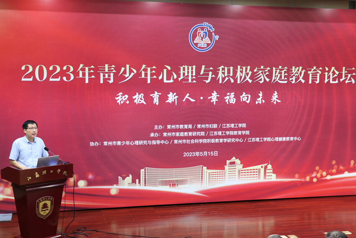 为学习贯彻教育部等十七部门《全面加强和改进新时代学生心理健康工作专项行动计划(2023—2025年)》,倡导积极推进家庭心理建设,营造健康幸福、积极向上的家校社协同育人氛围,5月15日上午,由常州市教育局、常州市妇联、我校联合举办的2023年青少年心理与积极家庭教育论坛,在校图书馆南报告厅顺利举行。校党委书记崔景贵,常州市政协副主席、常州市教育局局长完利梅出席开幕式并致辞。常州市家庭教育研究院全体成员,常州市中小学教师,校辅导员代表,教育学院部分教师,学前教育、应用心理学专业本科生及市人大代表、社会人士参加论坛。论坛分为两个阶段,分别由教育学院院长李德方和副院长张长英主持。
