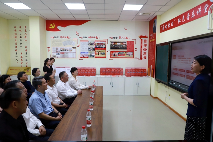 黄俊一行首先来到师范生教学实训中心,参观教育学院“乐之秋白”音乐讲堂,现场观摩音乐微党课《赤潮曲》。黄俊指出,《赤潮曲》由秋白作词作曲,无论内涵还是展现形式都极具艺术感染力,马凌教授呈现的精彩党课内容详实、声情并茂、感人至深,将党的光辉思想、革命先烈的英雄事迹通过红色音乐作品进行了淋漓尽致的表达,具有深远的教育意义。