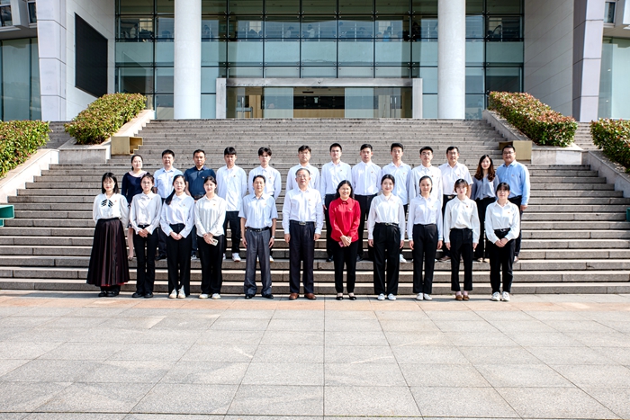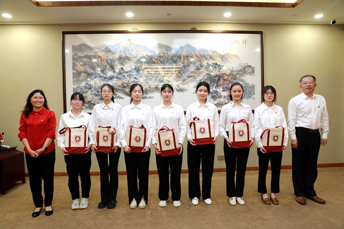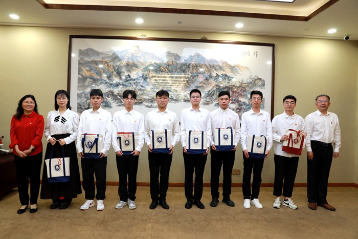 最后,崔景贵、周兰珍代表学校向党员毕业生代表赠送学校文创纪念品并合影留念。(图/大学生通讯社 胥彦名、黄紫园;文/学生工作处 李金东、周阳;审核/王振伟;编辑/彭艳)