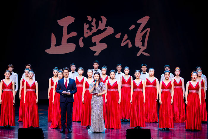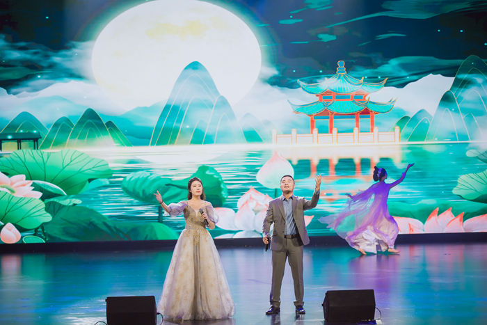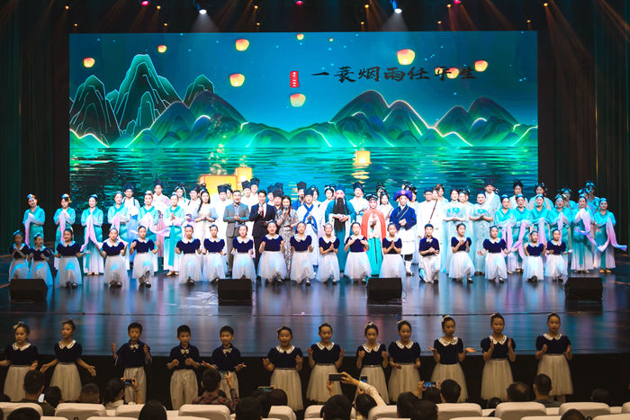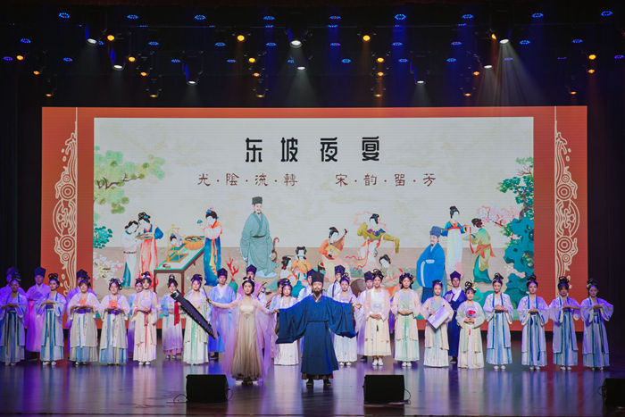 晚会在文化与旅游学院大学生气势恢弘的大合唱《正学颂》中拉开帷幕,文言文写就的歌词铿锵有力,传递“00后”文化传承者向上向善的力量。由校团委招募的汉服国风社带来的《东坡夜宴》以沉浸式歌舞演艺方式,创新展示东坡与好友、弟子的君子情谊,让传统文化映照现代生活。我校教工舞蹈团龙一平、单文霞、靳婷婷、毛沁红等成员,在只此青绿的水墨画间翩翩起舞,宋式美学扑面而来。教育学院梁庆东、校团委贾宁慧男女声二重唱《锦瑟》如高山流水、婉转动听,将诗词之美展现得淋漓尽致。常州市东坡小学师生精心编排的情景剧《又见东坡》、合唱《像你一样的人》展现现代化诗书校园里的孩子们学习东坡文化,传承东坡精神,千年文脉在时代新人身上得到传承。常州朗诵吟诵艺术协会秦坚毅、蒋涌涛带来“梦回大宋”宋韵诗词会,曾登上过央视的京剧《东坡夜泊舣舟亭》讲述了东坡与常州城的动人故事。