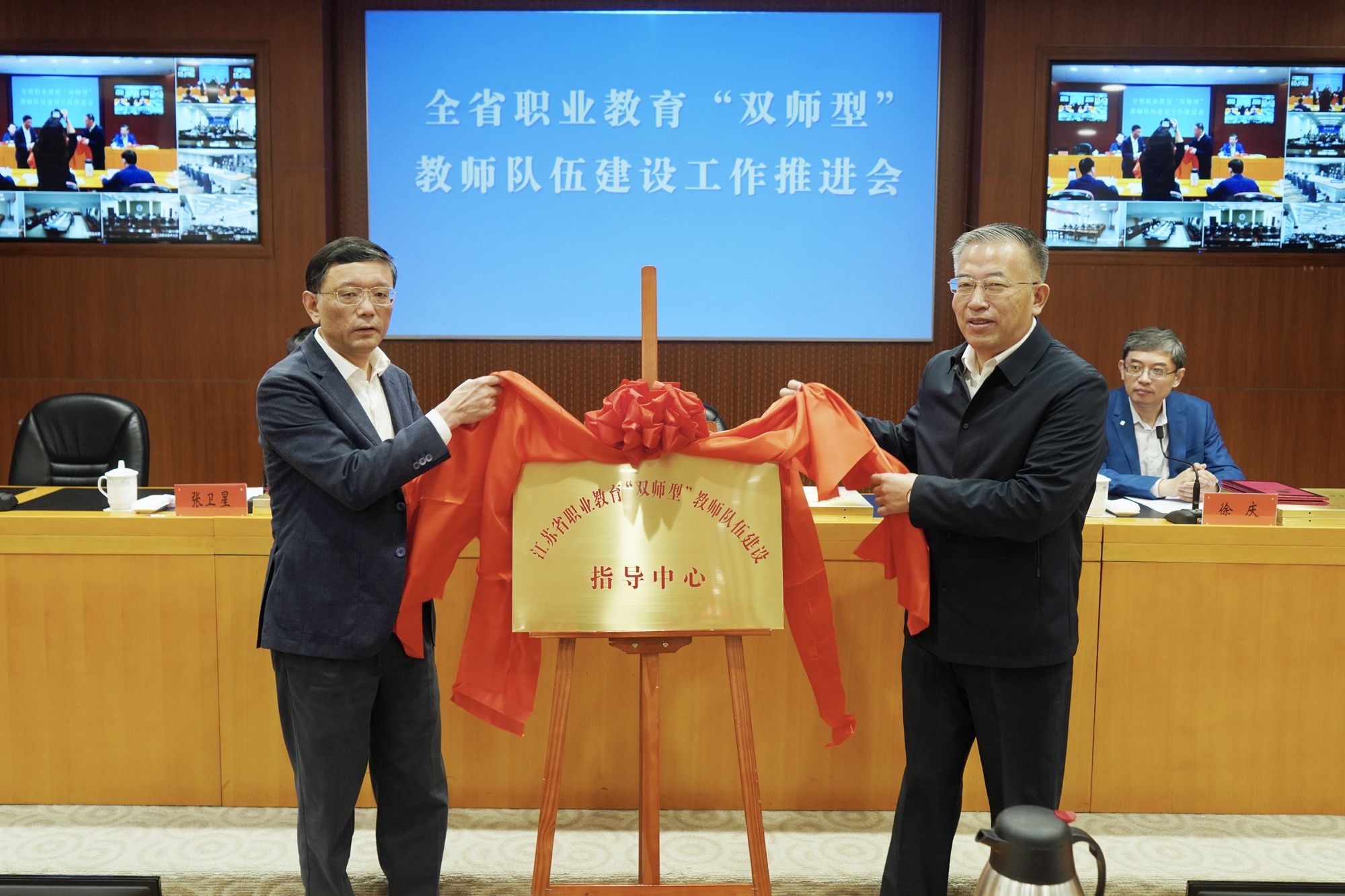 会上,张卫星宣读了《省教育厅关于成立江苏省职业教育“双师型”教师队伍建设指导中心的通知》,潘漫和崔景贵为江苏省职业教育“双师型”教师队伍建设指导中心揭牌。徐庆宣读了《省教育厅关于成立江苏省职业教育“双师型”教师认定工作专家委员会的通知》。我校为专家委员会副主任单位。与会领导为“双师型”教师认定工作委员会专家和江苏省职业教育“双师型”教师团队协作组组长单位颁发聘书和铜牌。