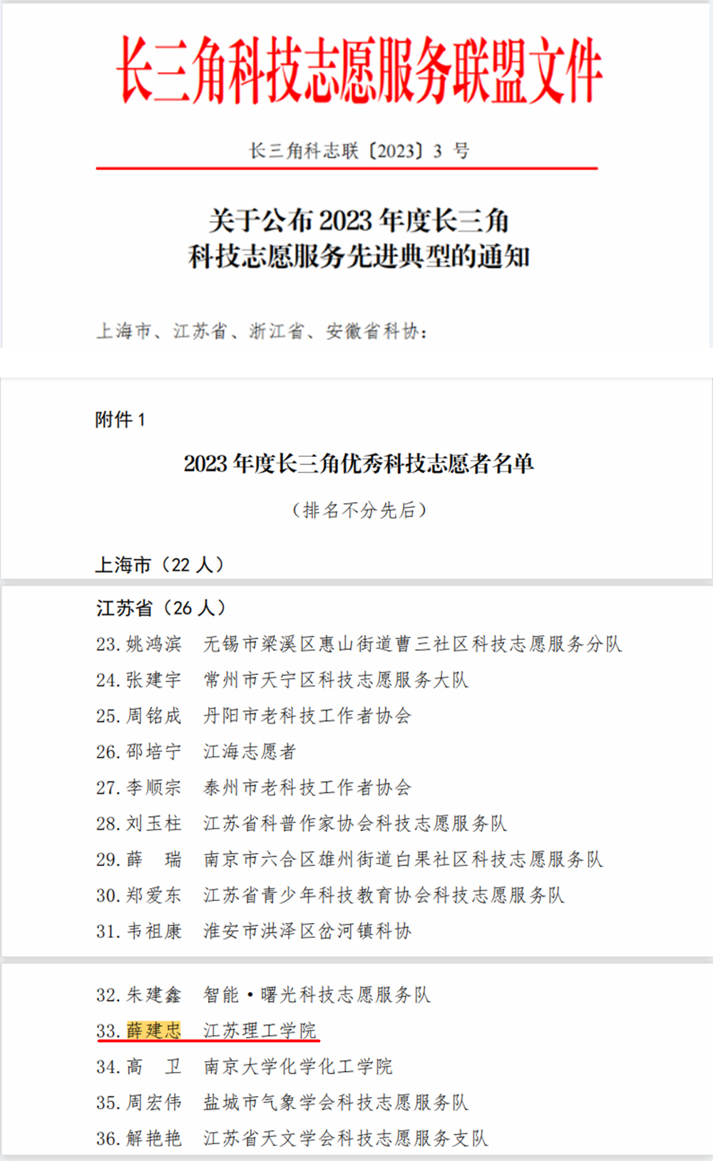 据了解,2020年,上海市科协、浙江省科协、江苏省科协、安徽省科协共同签订《长三角一市三省科协关于成立长三角科技志愿服务联盟的协议》,提出“广泛开展以科技惠民、科学普及等为主要内容的科技志愿服务,助力长三角高质量一体化发展”的工作目标。2023年,经长三角一市三省科协推荐和长三角科技志愿服务联盟研究,江苏省共选树26名科技志愿者,其中高校仅有我校和南京大学2人受到表彰。(文/王建文、张永政;审核/梁国斌;编辑/黄妤)