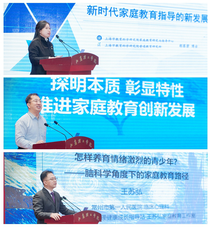 教育学院副院长、常州市家庭教育研究院副院长张长英主持专题报告环节。专题报告环节,上海市教科院家庭教育研究与指导中心主任、长三角家校合作研究与指导联盟秘书长、《家庭教育指导》杂志副主编、中国教育学会家庭教育专业委员会理事郁琴芳,带来题为“新时代家庭教育指导的新发展”的报告。报告认为,家庭教育已经进入战略发展的新时期,因此,家庭教育指导亟需新发展。家庭教育需要在达成共识的基础上,促进协同,继而付诸治理行动。聊城大学高等教育研究院副院长、中国家庭教育学会理事、常州市家庭教育研究院专家委员会副主任王连森,带来题为“探明本质、彰显特性推进家庭教育创新发展”的报告。他讨论了家庭教育的本质和内涵,探索了家庭教育的途径,揭示了家庭教育的特性。医学博士、主任医师、常州市第一人民医院临床心理科副主任、德国海德堡大学医院访问学者、常州市“王苏弘家庭教育工作室”、心理健康成长指导站领衔人王苏弘,带来题为“怎样养育情绪激烈的青少年?——脑科学角度下的家庭教育路径”的报告,基于自身医学工作的实践和经验,从脑科学的角度探讨了青少年情绪激烈的原因及应对养育情绪激烈孩子的有效策略。