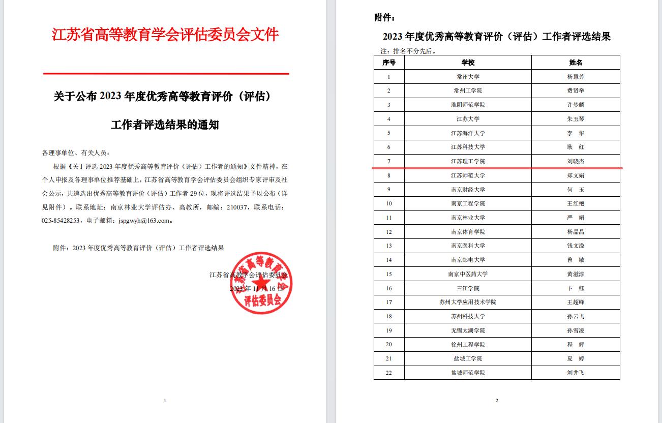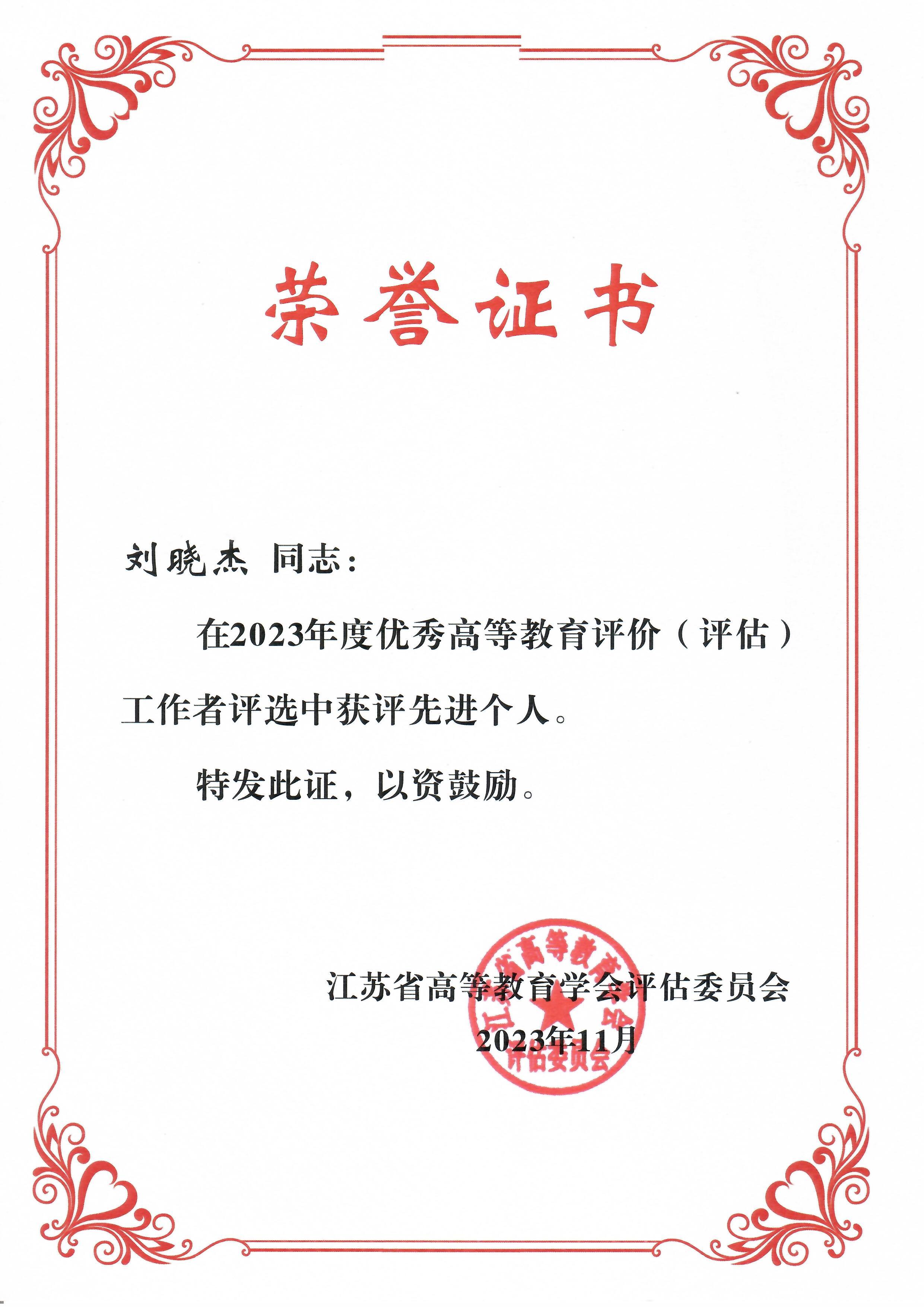 近日,江苏省高教学会评估委员会公布了2023 年度优秀高等教育评价(评估)工作者评选结果,我校党委常委、统战部部长、教学质量监控与评估处处长刘晓杰被评为“2023年度优秀高等教育评价(评估)工作者”。