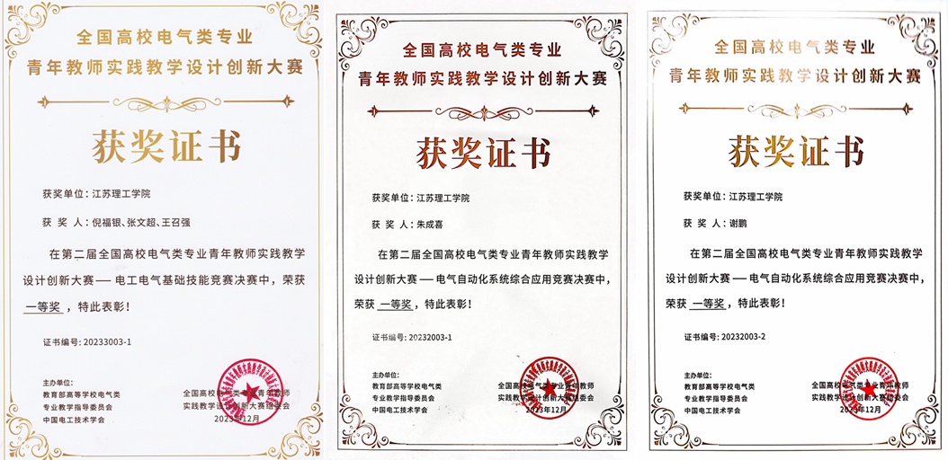11月30日至12月2日,第二届全国高校电气类专业青年教师实践教学设计创新大赛在浙江金华圆满落幕。大赛由教育部高等学校电气类专业教学指导委员会与中国电工技术学会联合主办,中国电工技术学会电气工程教育专业委员会与浙江金华职业技术学院承办,浙江大学、浙江师范大学协办。我校电气信息工程学院组织两支队伍参赛,倪福银老师带领张文超、王召强两位学生组队参加“电工电气基础技能竞赛”,朱成喜、谢鹏两位老师组队参加“自动化系统综合应用竞赛”,两支队伍双双喜获一等奖。