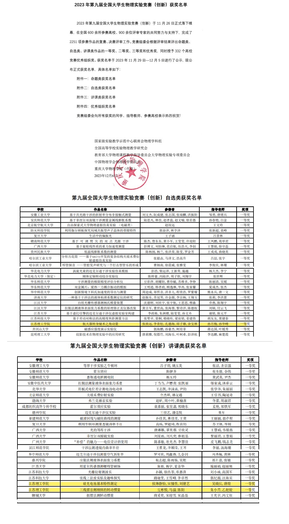 据悉,全国大学生物理实验竞赛是目前国内挑战性最强、影响力最大的物理类竞赛之一,不仅考验参赛学生的理工思维能力,更考验学生的综合创新能力。我校自2020年首次参赛以来,整体获奖质量与数目连创新高,四年来共16支队伍参赛,累计获得国家级一等奖8项,二等奖5项和三等奖2项。(图文/数理学院 吴晓庆;审核/季敏;编辑/许琳)