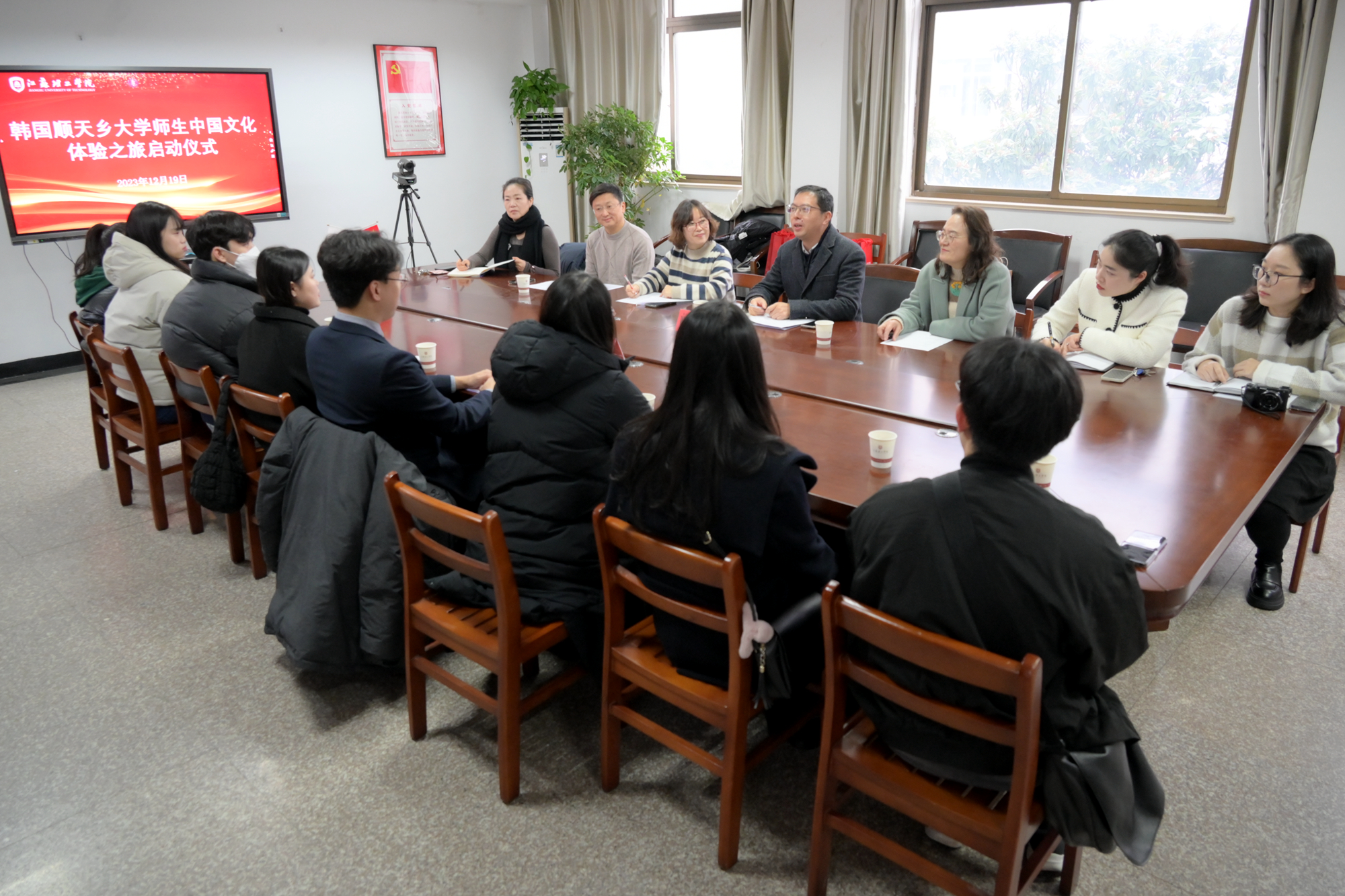 12月19日上午,韩国顺天乡大学师生中国文化体验之旅启动仪式在国教楼会议室举办,党委常委、副校长王俊会见了顺天乡大学师生代表团一行8人,国际合作与交流处全体人员参加会谈。启动仪式由国际合作与交流处副处长项寅主持。