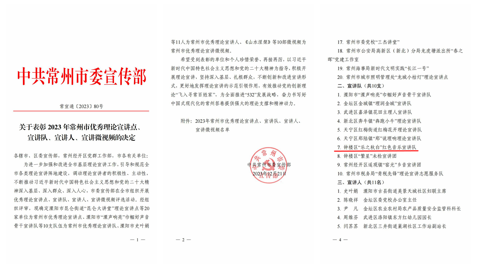 近日,由中共常州市委宣传部组织的2023年常州市优秀理论宣讲点、宣讲队、宣讲人、宣讲微视频评选结果公布。我校教育学院马凌教授创立的“乐之秋白”红色文艺宣讲队获评“优秀理论宣讲队”称号。