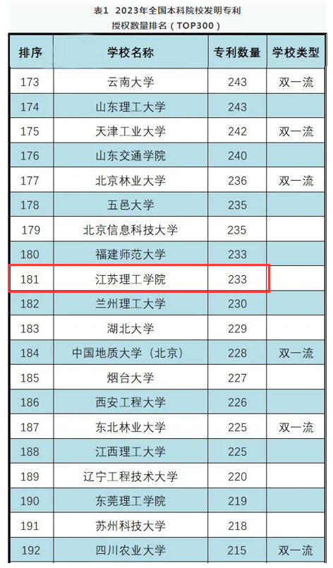 近日,2023年全国本科院校发明专利授权数量排名发布,我校位列全国本科院校第181名,位列江苏省本科院校第24名。该排名由神针评价研究团队根据公开的发明专利数据整理发布。