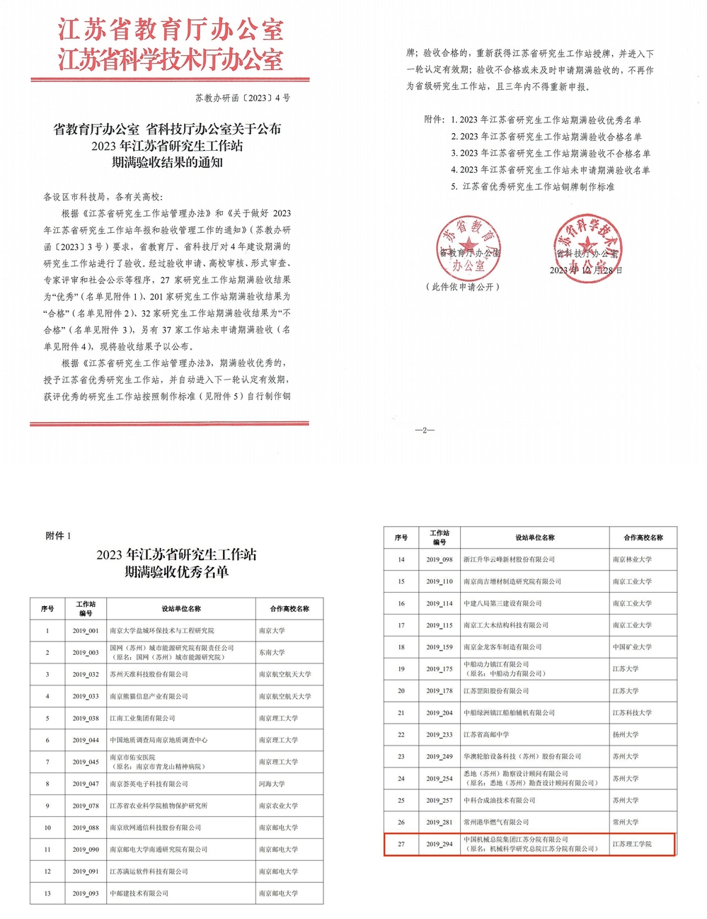 机械工程学院雷卫宁教授深切回顾了校企双方十年来在科技攻关、人才输送、实习实践等方面的友好合作基础。党委研究生工作部部长贾仕林宣读了《省教育厅办公室 省科技厅办公室关于公布2023年江苏省研究生工作站期满验收结果的通知》,全省297家研究生工作站参与验收申请、高校审核、形式审查、专家评审、社会公示等程序,仅27家研究生工作站期满验收结果为“优秀”,我校与中国机械总院集团江苏分院有限公司共建的江苏省研究生工作站获评为优秀等次,全省优秀率仅为9%。戴国洪与曹云翔一起为江苏省优秀研究生工作站挂牌。