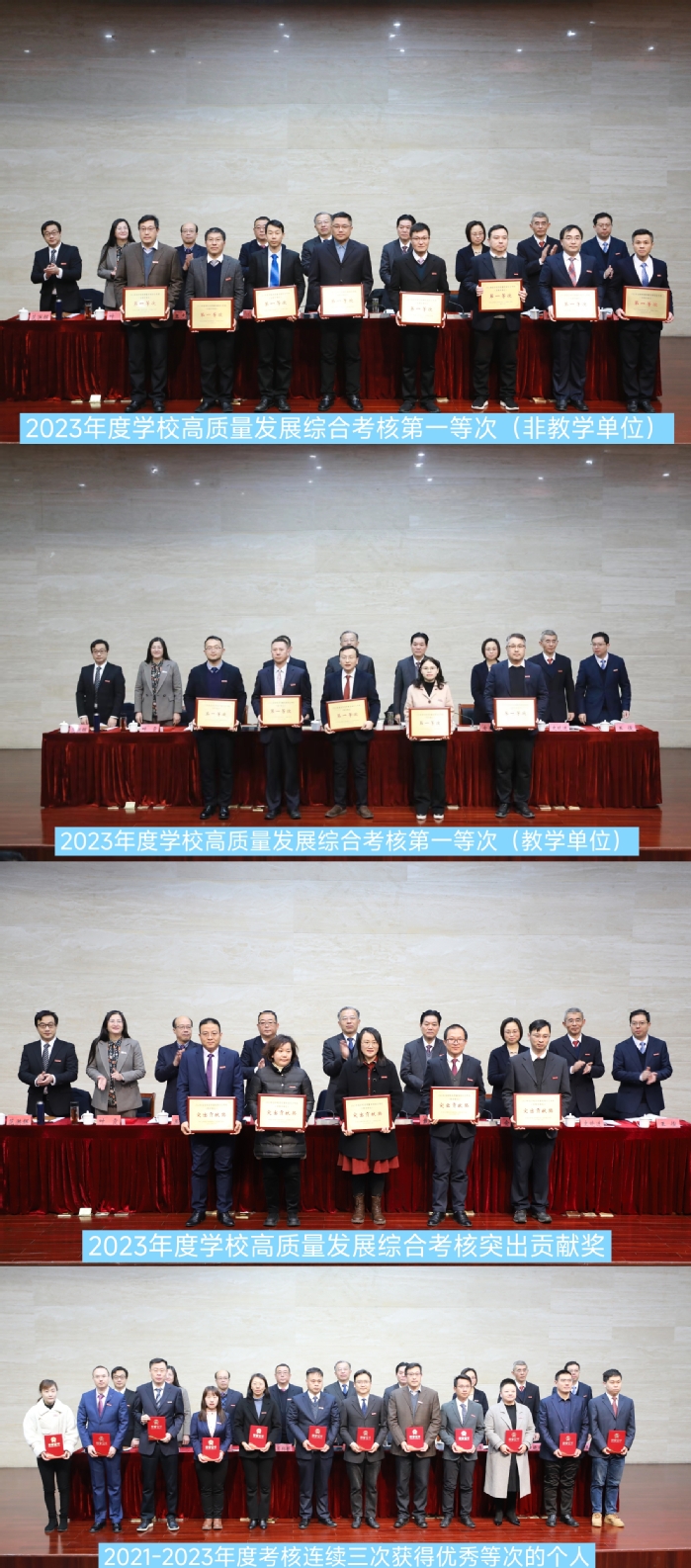会议表彰了学校2023年度高质量发展综合考核第一等次单位、突出贡献奖单位和2021-2023年度考核连续三次获得优秀等次的个人,党委常委、副校长俞亚萍,党委常委、副校长王志华宣读有关表彰文件,全体校领导为获奖单位、个人颁发奖牌和证书。电气信息工程学院、教育学院、学生工作处、教学质量监控与评估处等受表彰单位的主要负责人作交流发言。