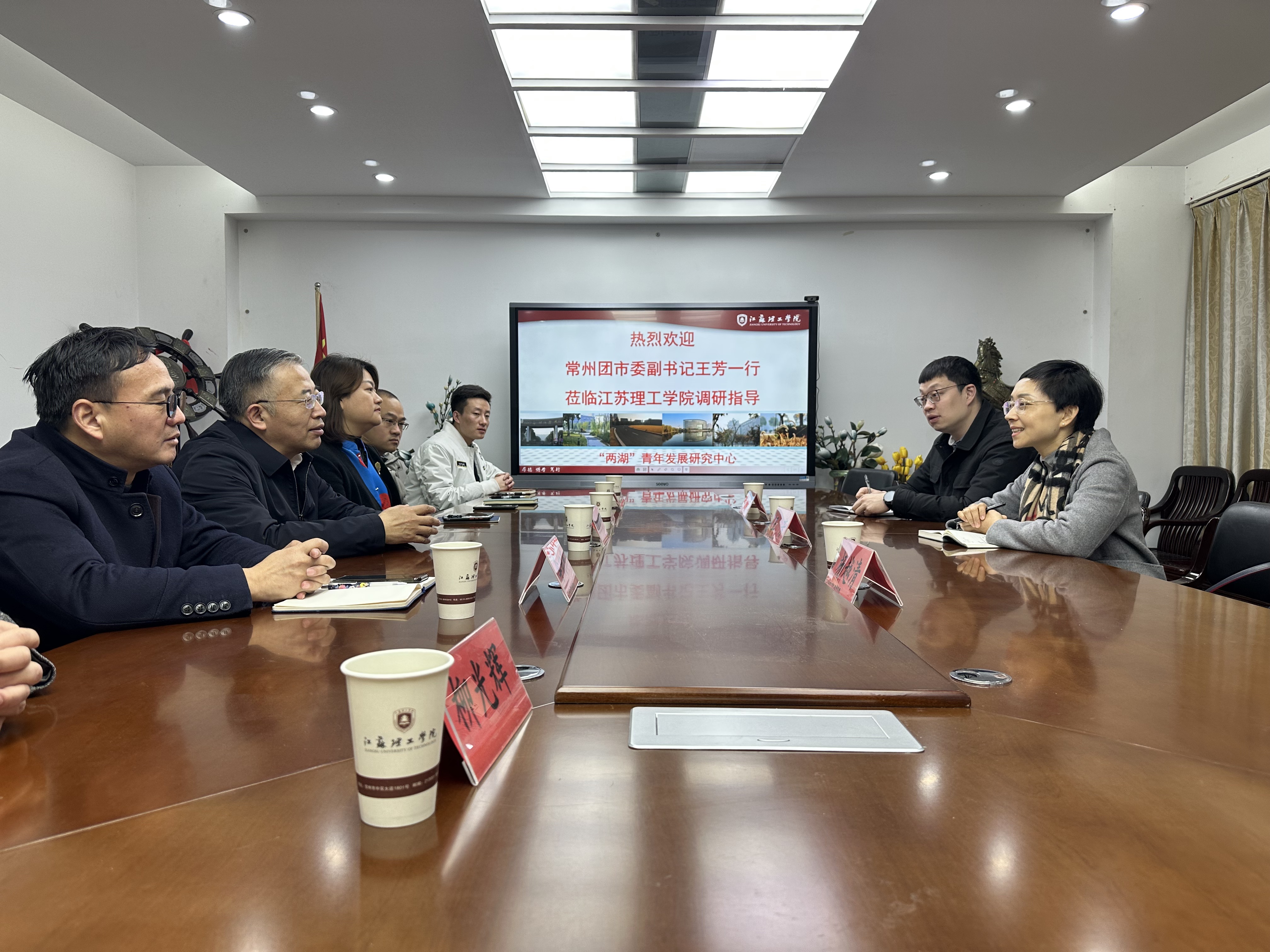 3月8日上午,常州团市委副书记王芳一行来校调研“两湖”青年发展研究中心。校党委书记崔景贵,团委、管理学院、经济学院相关负责人,我校校友、市青商会成员柳光辉,苏文电能下属分公司斯贝尔电气总经理苏海超参加会议。