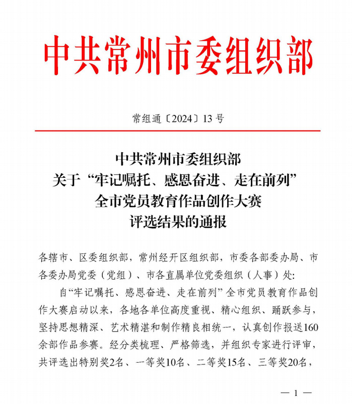 据悉,党员教育作品创作大赛获奖优秀作品将在常州组工网、常州龙城先锋微信平台、常州广播电视台《龙城先锋》栏目等平台进行展播。我校将进一步围绕中心大局,积极整合资源,将优质作品作为党员教育培训的重要内容,教育引导广大党员牢记嘱托、感恩奋进,提升党员教育吸引力、感染力。(文/组织部 刘艳;审核/羊悦、高凯;编辑/周雅倩)