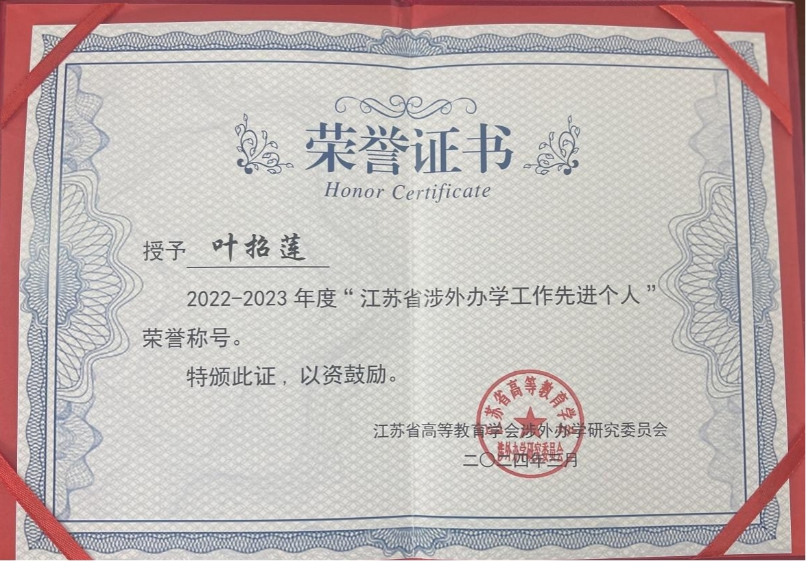 3月28日,江苏省高等教育学会涉外办学研究委员会2023年年会在徐州召开,会议对涉外办学工作先进单位和个人进行表彰。经书面申请、大会常务理事会评审、省教育厅审核等程序,我校获评江苏省涉外办学工作先进单位,资源与环境工程学院院长叶招莲获评江苏省涉外办学工作先进个人。