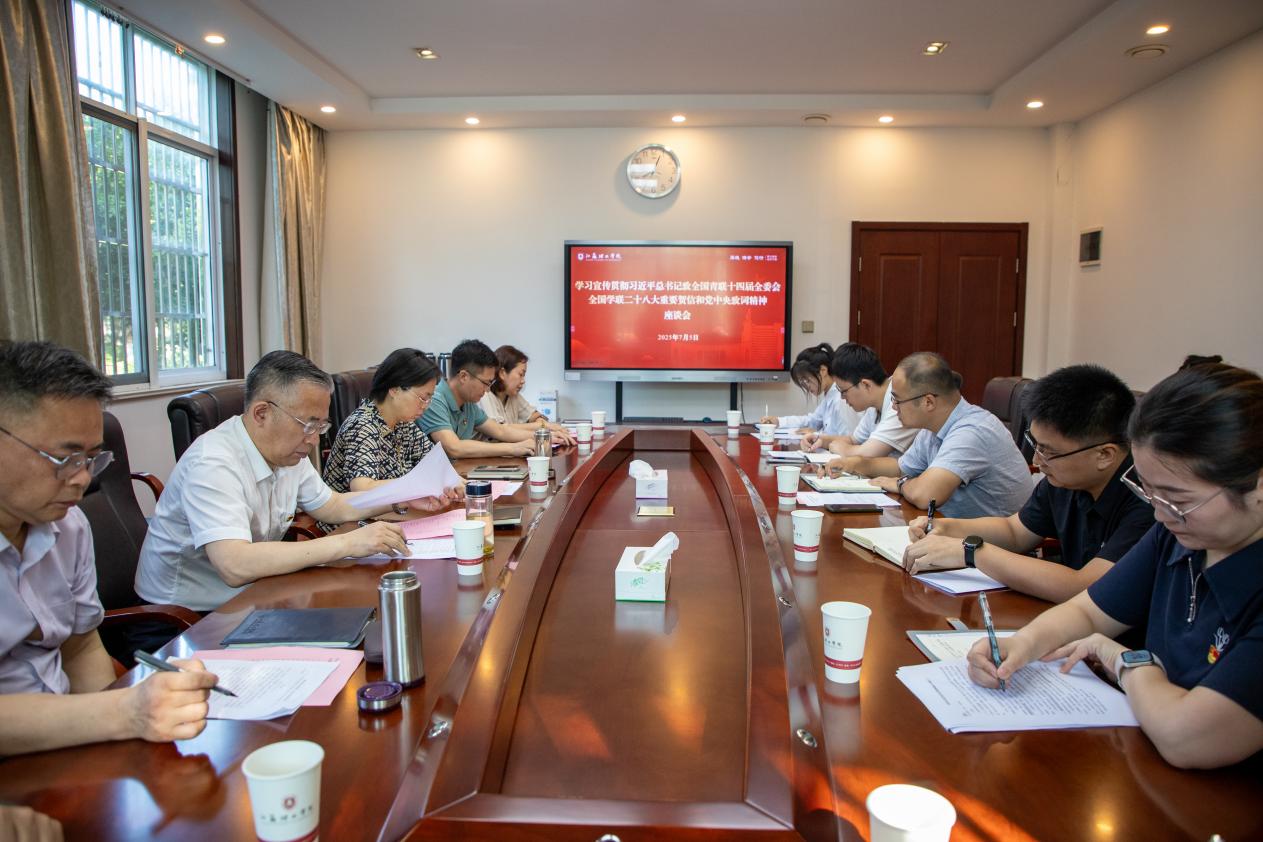 7月5日上午,我校在正德楼第一会议室召开学习宣传贯彻习近平总书记致全国青联十四届全委会、全国学联二十八大重要贺信和党中央致词精神座谈会。校党委书记崔景贵,党委研究生工作部、党委学生工作部、校团委相关负责人以及部分团学代表、青年代表参加座谈会。座谈会由党委常委、副校长俞亚萍主持。