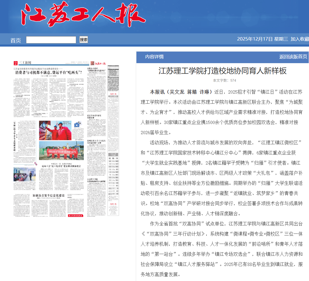 作为全省首批“双高协同”试点单位,江苏理工学院与镇江高新区共同出台《“双高协同”三年行动计划》,系统构建“微课程+微专业+微校区”三位一体人才培养机制,打造教育、科技、人才一体化发展的“前沿哨所”和青年人才落地的“第一站台”。连续多年举办“镇江专场双选会”,联合镇江市人力资源和社会保障局设立“镇江人才服务驿站”。2025年已有88名毕业生到镇江就业,服务地方高质量发展。