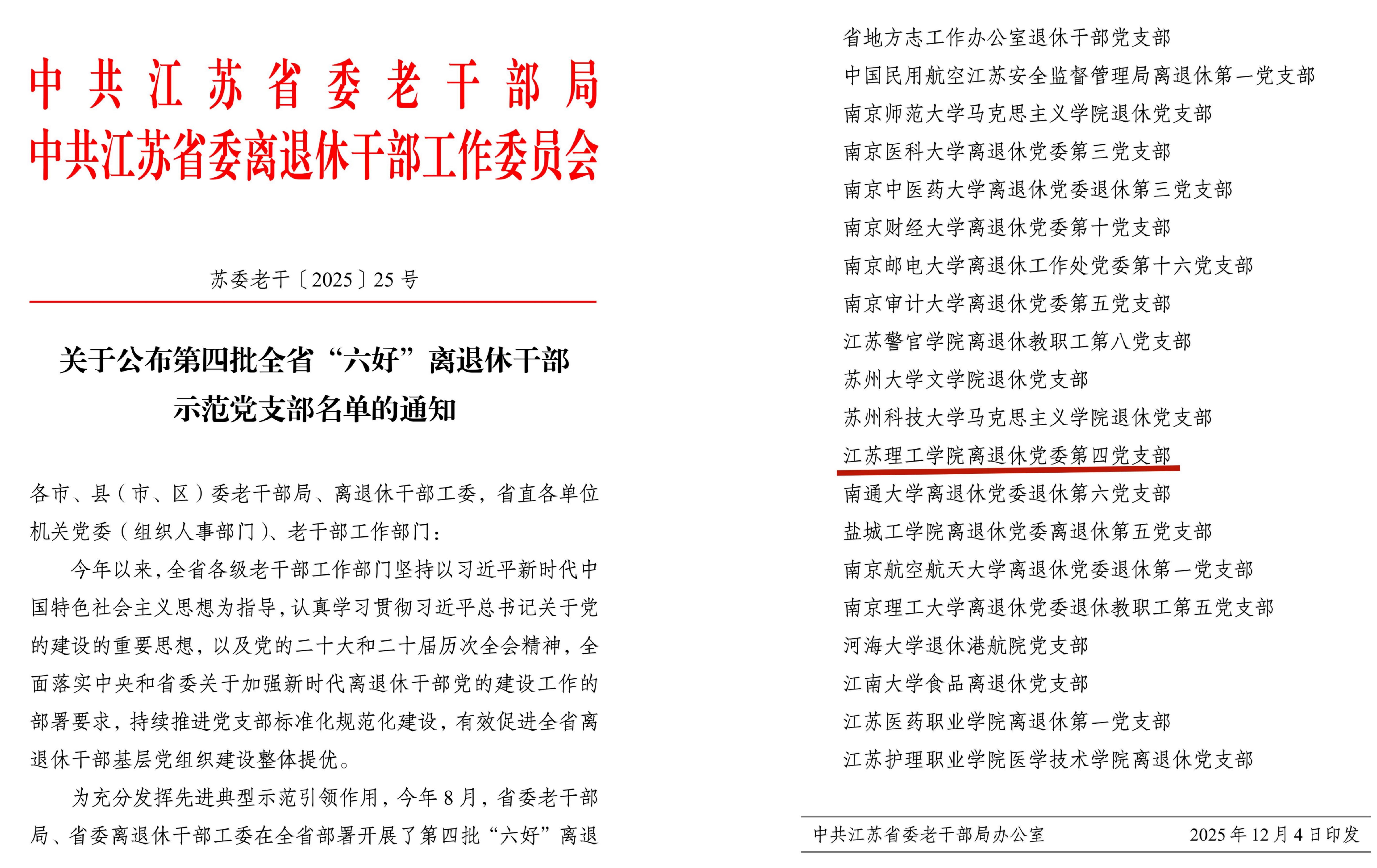 近日,中共江苏省委老干部局、中共江苏省委离退休干部工委公布第四批全省“六好”离退休干部示范党支部名单,我校离退休党委第四党支部成功入选,获评全省“六好”离退休干部示范党支部。