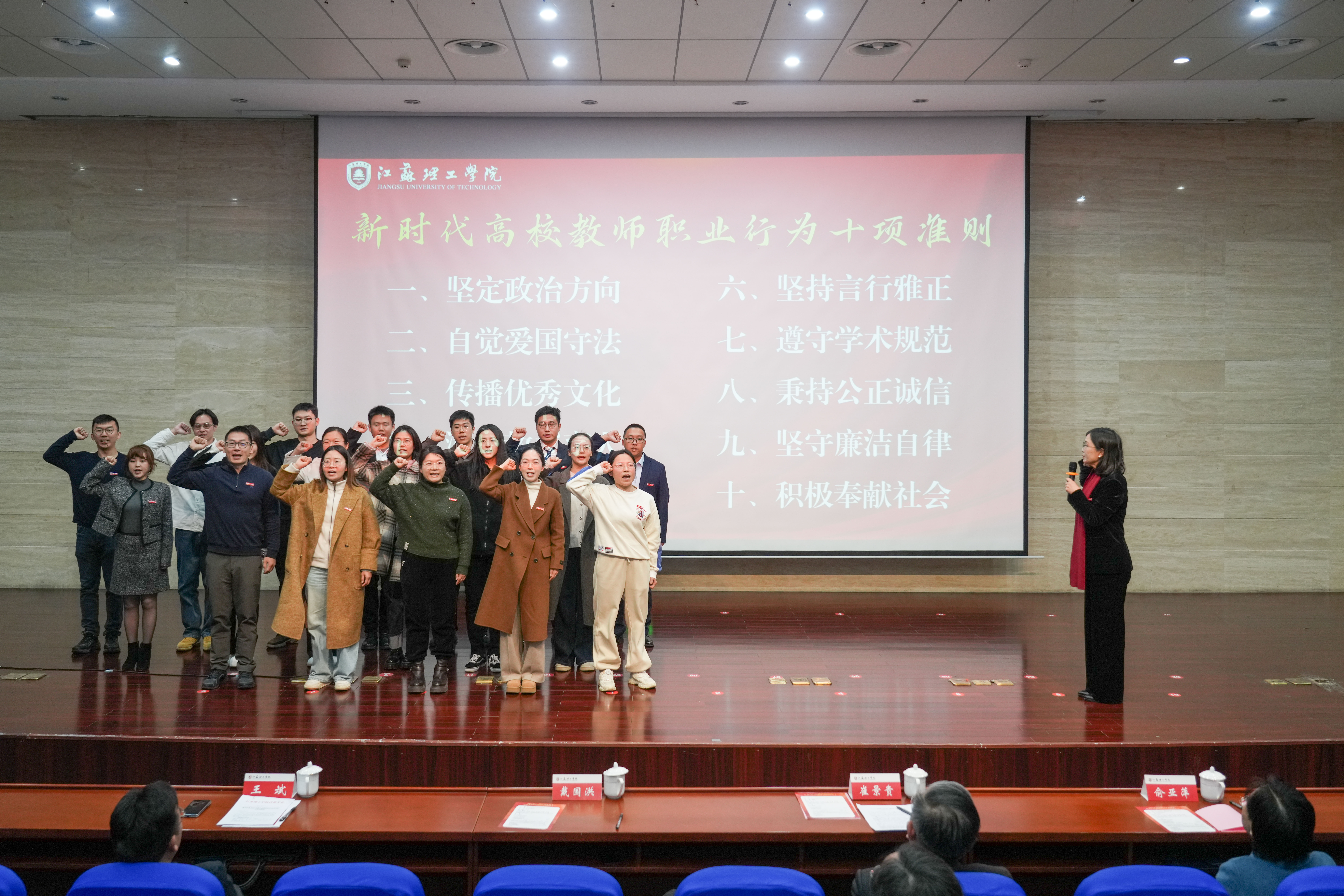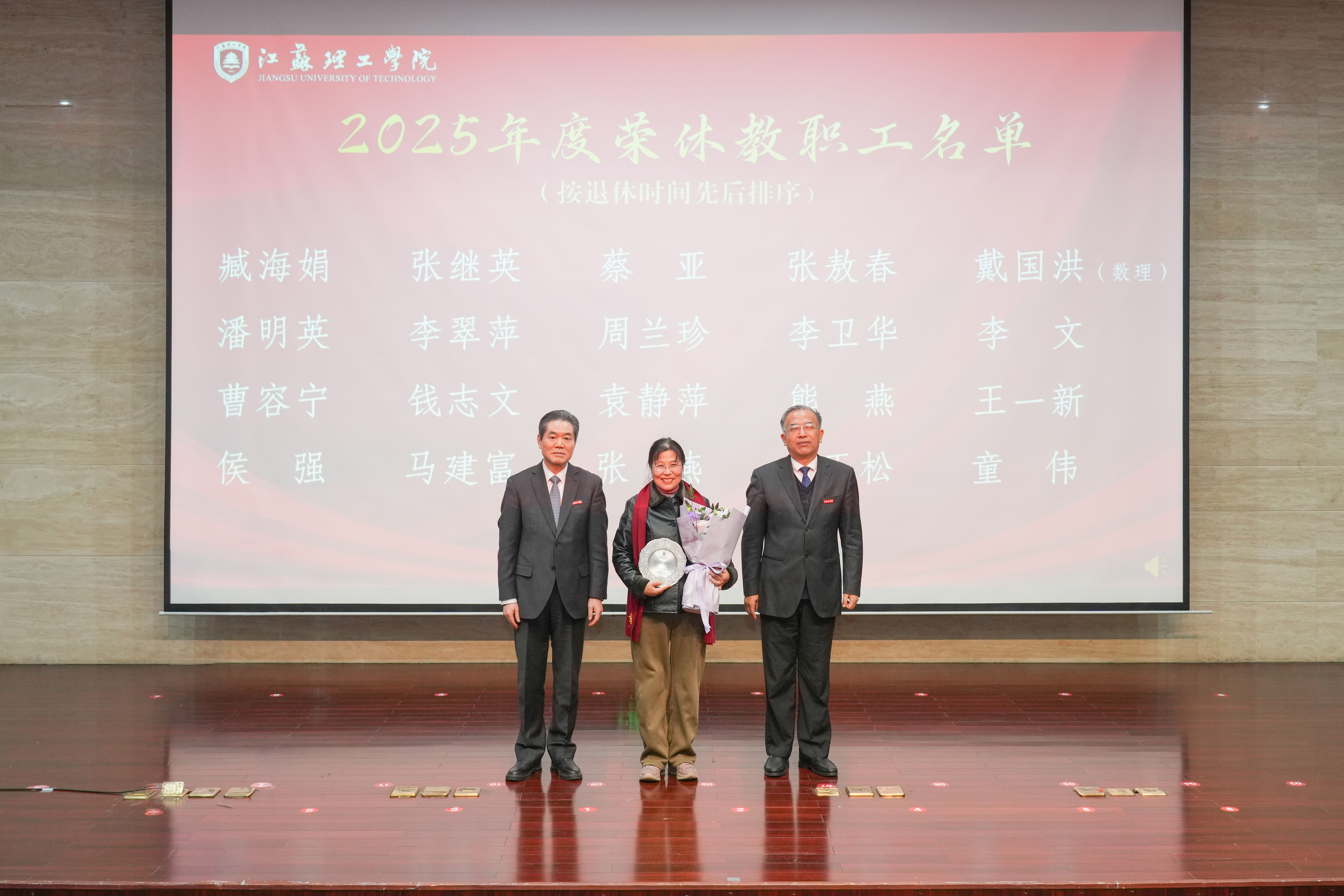 活动在荣休教职工风采视频展播中启幕。俞亚萍、王斌分别宣读2025年度荣休教职工名单、新入职教师教学能力大赛获奖名单与校本培训优秀学员名单。崔景贵、戴国洪为荣休教职工颁发纪念品、送上鲜花并一一合影留念。俞亚萍为新入职教师教学能力大赛获奖教师代表和校本培训优秀学员代表颁发荣誉证书。荣休教师代表、电气信息工程学院钱志文发表感言,她深情回顾了三十八载从教生涯,表达了对教育事业和学校的深厚眷恋。新老教师于海武、王锋、臧海娟、童伟携手演绎诗朗诵《师道长流,强国新篇》。荣休教师代表李卫华带领新教师代表共同宣读《新时代高校教师职业行为十项准则》。